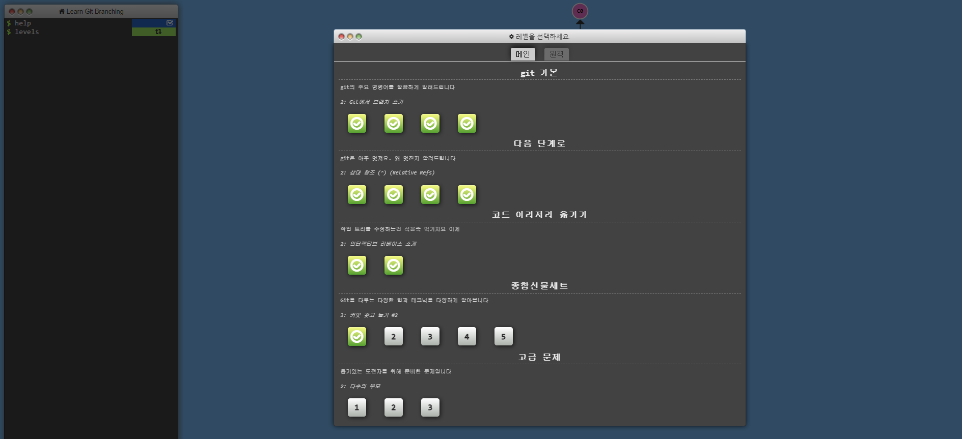 이브와에서 깃 공부로 git 테스트를 만들어줬는데요 이정도까지 해봤지만,, git는 이해하기 어렵네요 실전으로 해봐야 어디서 쓰는지 왜 이 명령어가 필요한지 확실하게 이해할 수 있을 것 같아요 아마 이 사이트를 번역한 것 같더라고요 나름 git을 머리에 집어 넣었어요 ㅋㅋㅋㅋ https://learngitbranching.js.org/?locale=ko Learn Git Branching An interactive Git visualization tool to educate and challenge! learngitbranching.js.org 어쨌든 수료증 받고 마무리~! 프로젝트 잘 돼서 코엑스에 발이라도 딛고 싶네요!!